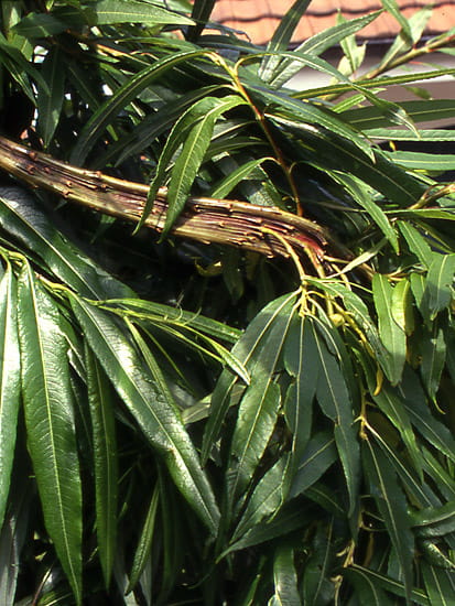 Liście lancetowate, długie na górnej stronie blaszki ciemnozielone, błyszczące,