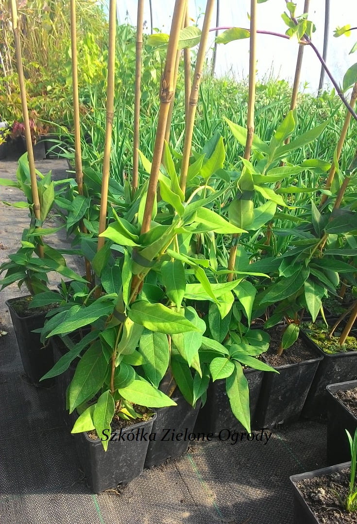Atrakcyjny, zimozielony wiciokrzew o lancetowatych, ciemnozielonych, błyszczących liściach o długości do 12 cm i szerokości 2-3 cm.